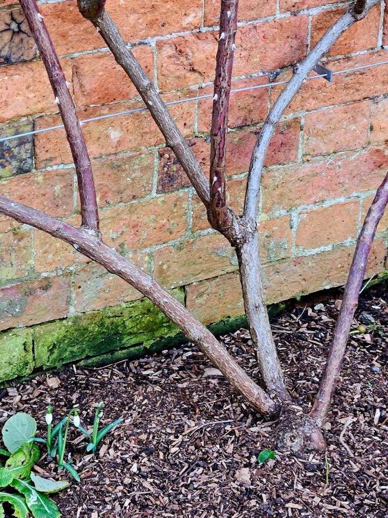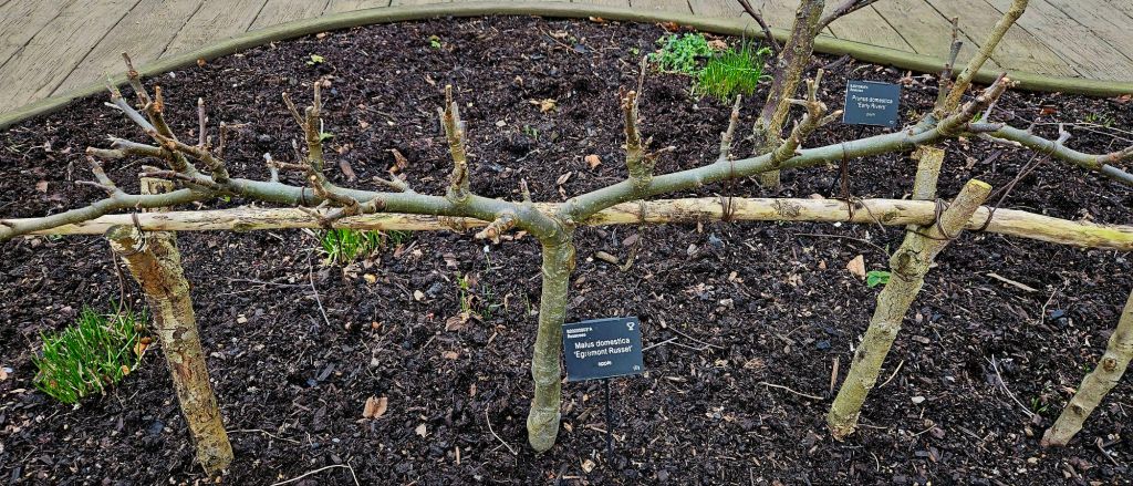 - Step-over Apples: These horizontally trained apple trees blossom in spring, their low-growing form providing a unique structural element and autumn fruits.